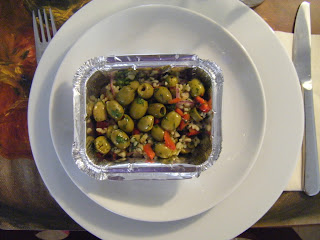 Foi num dos dias de Verão que houve na semana passada, e como a maioria dos sítios não tem AC, estava muito calor lá dentro e encomendámos para comer em casa.Uma salada fria de entrada com azeitonas e bulgur, adivinho.